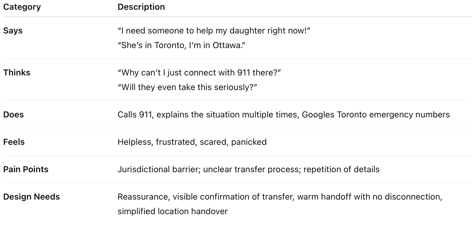 Mapped scenarios for the three emergency call scenarios with empathy quadrants: Says, Thinks, Does, Feels— plus identified Pain Points and Design Needs for each persona: